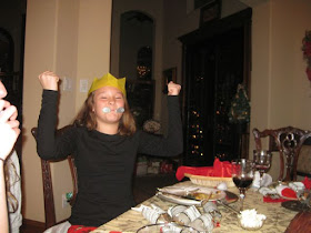 Then we opened our Christmas crackers (a tradition that started when we lived in England in the early 90's)! Of course, we all had to put on our crowns, read the jokes from the crackers, and play with the whistles we found in them! After the Christmas cracker fun, it was time for dessert: my cranberry apple strudel and vanilla ice cream and my dad's "chocolate surprise."