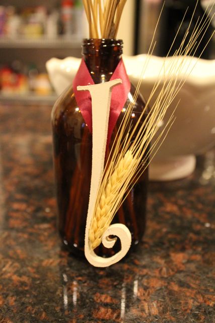 3. Take four pieces of wheat out of the bunch. Cut off the "stem" part, and hot glue one "bloom" part to each of the letters. Slip the letters over the mouth of each bottle.
